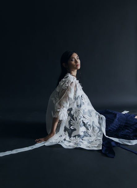 STUDIO JEJE’s collection highlight for exploration of fabrics: kerancang embroidery, hand weaving, embellishment, and pleating. A romantic fusion where complex fabric exploration technique and touch of Indonesian culture come together, maintaining each value as an exquisite aesthetic.
